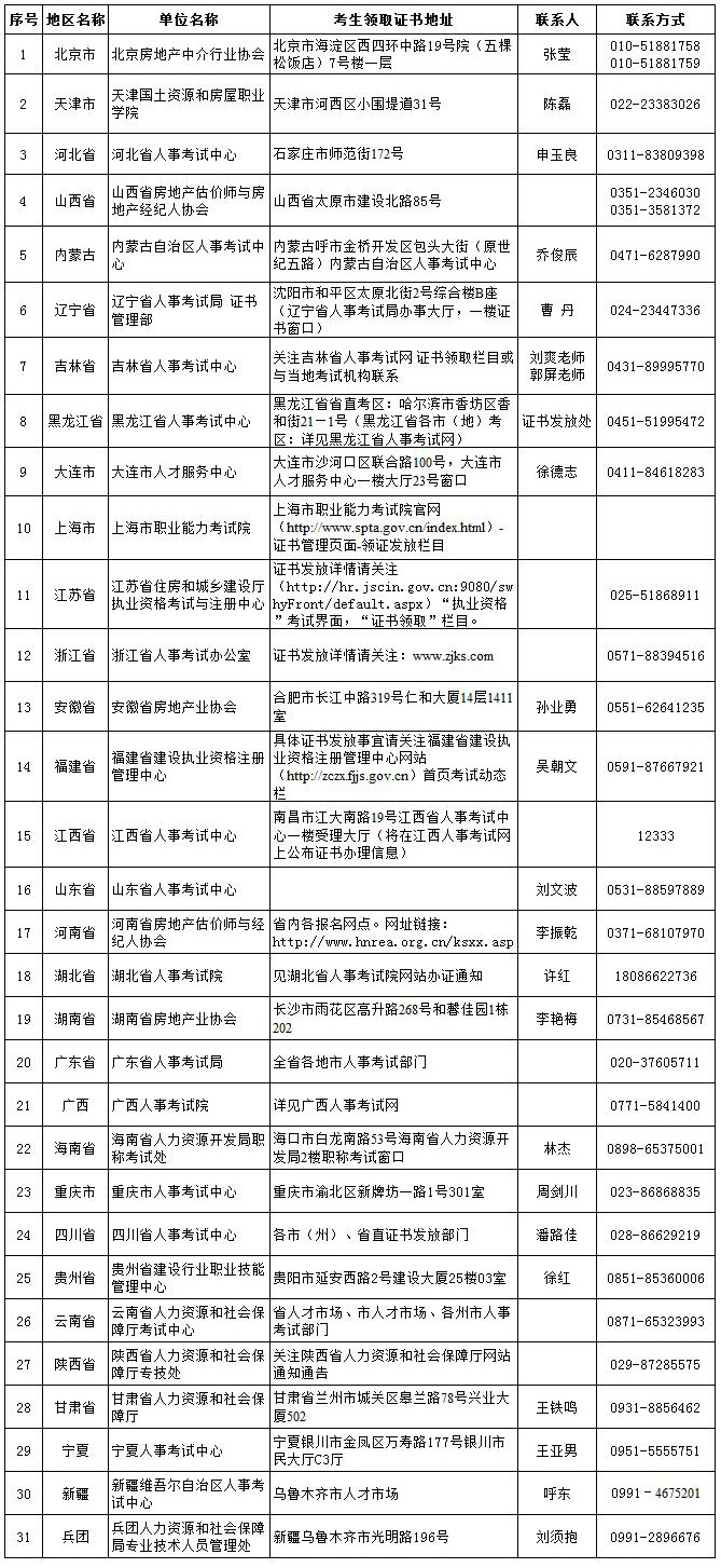 證書領取單位名稱、地址及聯系方式見附表(附件下載),具體領取時間以各地方考試實施機構安排為準。