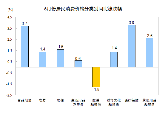 6月份,其他七大類價格同比六漲一降。其中,醫療保健、其他用品和服務、居住、衣著、教育文化和娛樂、生活用品及服務價格分別上漲3.8%、2.6%、1.6%、1.4%、1.4%、0.6%;交通和通信價格下降1.8%。