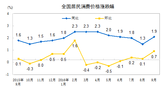 2016年9月份居民消費價格同比上漲1.9%