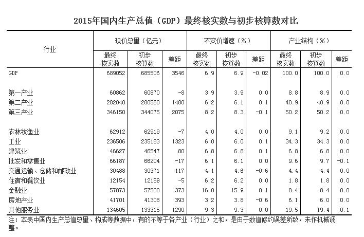 經最終核實,2015年,GDP現價總量為689052億元,比初步核算數增加了3546億元;按不變價格計算,比上年增長6.9%,與初步核算數一致。三次產業和各行業數據見附表。