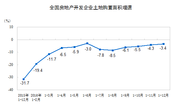 2016年,房地產(chǎn)開發(fā)企業(yè)土地購(gòu)置面積22025萬(wàn)平方米,比上年下降3.4%,降幅比1-11月份收窄0.9個(gè)百分點(diǎn);土地成交價(jià)款9129億元,增長(zhǎng)19.8%,增速回落1.6個(gè)百分點(diǎn)。