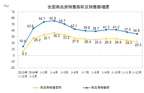 2016年,商品房銷售面積157349萬(wàn)平方米,比上年增長(zhǎng)22.5%,增速比1-11月份回落1.8個(gè)百分點(diǎn)。其中,住宅銷售面積增長(zhǎng)22.4%,辦公樓銷售面積增長(zhǎng)31.4%,商業(yè)營(yíng)業(yè)用房銷售面積增長(zhǎng)16.8%。商品房銷售額117627億元,增長(zhǎng)34.8%,增速回落2.7個(gè)百分點(diǎn)。其中,住宅銷售額增長(zhǎng)36.1%,辦公樓銷售額增長(zhǎng)45.8%,商業(yè)營(yíng)業(yè)用房銷售額增長(zhǎng)19.5%。