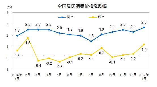 2017年1月份居民消費價格同比上漲2.5%