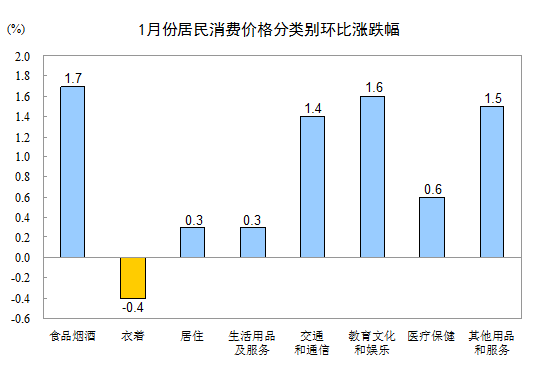 1月份,其他七大類價格環比六漲一降。其中,教育文化和娛樂、其他用品和服務、交通和通信、醫療保健、居住、生活用品及服務價格分別上漲1.6%、1.5%、1.4%、0.6%、0.3%和0.3%;衣著價格下降0.4%。
