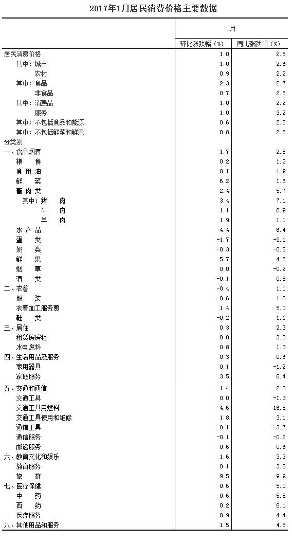 2017年1月份,全國居民消費價格總水平同比上漲2.5%。其中,城市上漲2.6%,農村上漲2.2%;食品價格上漲2.7%,非食品價格上漲2.5%;消費品價格上漲2.2%,服務價格上漲3.2%。