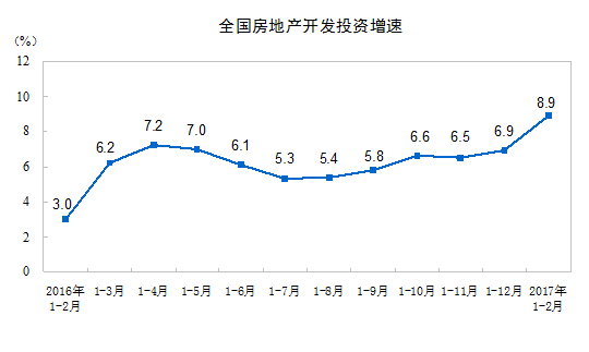 2017年1-2月份,全國房地產開發投資9854億元,同比名義增長8.9%,增速比去年全年提高2個百分點。其中,住宅投資6571億元,增長9.0%,增速提高2.6個百分點。住宅投資占房地產開發投資的比重為66.7%。