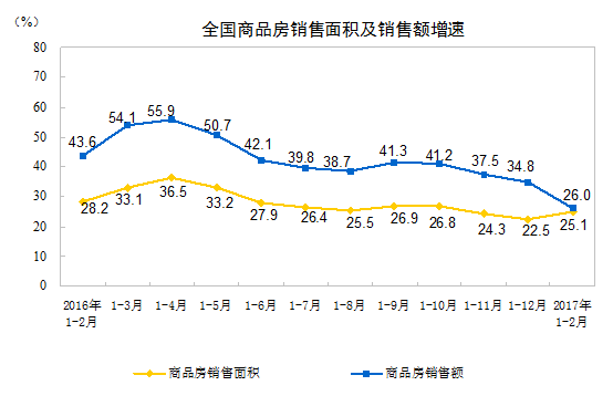 1-2月份,商品房銷售面積14054萬平方米,同比增長25.1%,增速比去年全年提高2.6個百分點。其中,住宅銷售面積增長23.7%,辦公樓銷售面積增長39.1%,商業營業用房銷售面積增長31.8%。商品房銷售額10806億元,增長26.0%,增速回落8.8個百分點。其中,住宅銷售額增長22.7%,辦公樓銷售額增長49.3%,商業營業用房銷售額增長41.6%。