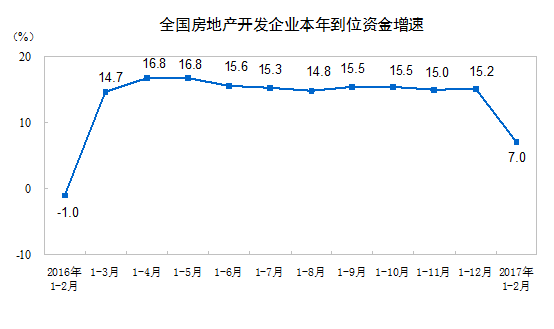 1-2月份,房地產開發企業到位資金22880億元,同比增長7.0%,增速比去年全年回落8.2個百分點。其中,國內貸款4985億元,增長11.5%;利用外資48億元,增長227.4%;自籌資金6897億元,下降17.2%;其他資金10950億元,增長27.7%。在其他資金中,定金及預收款6108億元,增長27.1%;個人按揭貸款3391億元,增長20.4%。