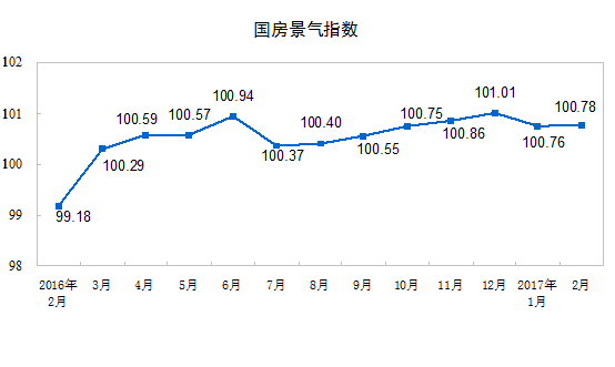 2月份,房地產開發景氣指數(簡稱“國房景氣指數”,今年起發布的是基期修定后的值)為100.78,比1月份提高0.02點。