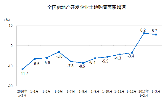 1-3月份,房地產(chǎn)開發(fā)企業(yè)土地購置面積3782萬平方米,同比增長5.7%,增速比1-2月份回落0.5個百分點;土地成交價款1359億元,增長16.7%,增速提高4個百分點。