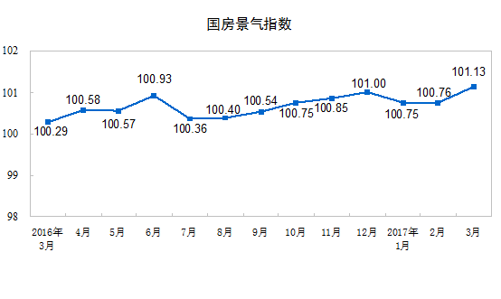 3月份,房地產(chǎn)開發(fā)景氣指數(shù)(簡稱“國房景氣指數(shù)”)為101.13,比2月份提高0.37點。