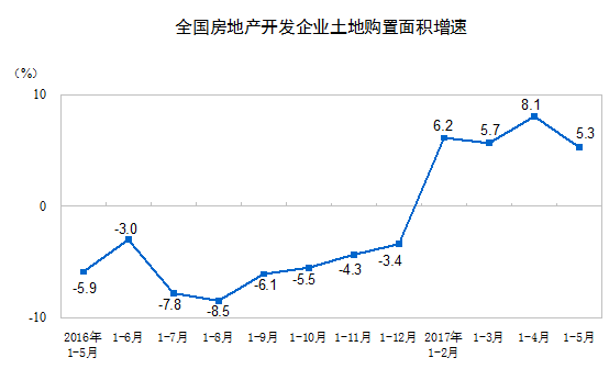 1-5月份,房地產開發企業土地購置面積7580萬平方米,同比增長5.3%,增速比1-4月份回落2.8個百分點;土地成交價款3036億元,增長32.3%,增速回落1.9個百分點。