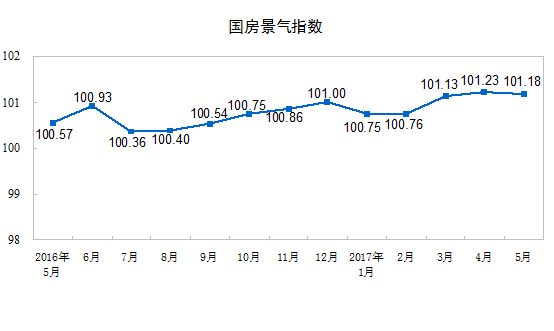 5月份,房地產開發景氣指數(簡稱“國房景氣指數”)為101.18,比4月份提高0.05點。