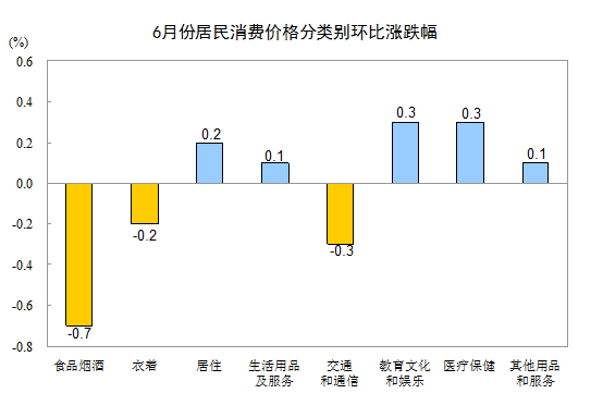 6月份,全國(guó)居民消費(fèi)價(jià)格環(huán)比下降0.2%。其中,城市下降0.1%,農(nóng)村下降0.2%;食品價(jià)格下降1.0%,非食品價(jià)格上漲0.1%;消費(fèi)品價(jià)格下降0.4%,服務(wù)價(jià)格上漲0.3%。