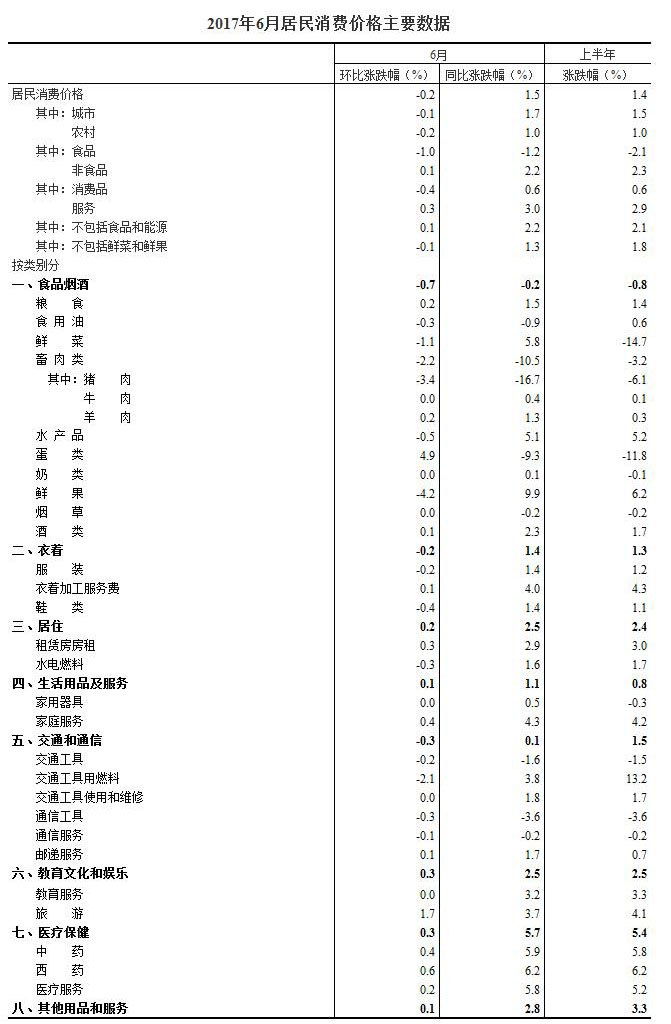 2017年6月份居民消費(fèi)價(jià)格同比上漲1.5%