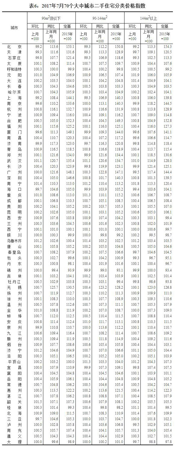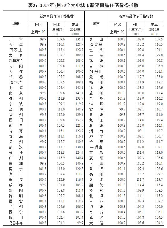 2017年7月份70個大中城市住宅銷售價格變動情況