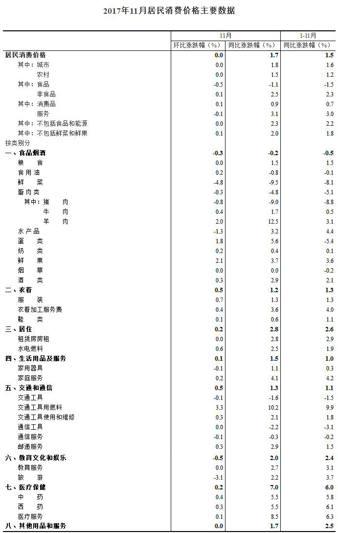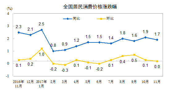2017年11月份居民消費(fèi)價(jià)格同比上漲1.7%