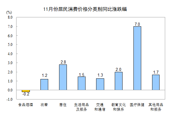 11月份,其他七大類價(jià)格同比均上漲。其中,醫(yī)療保健、居住、教育文化和娛樂價(jià)格分別上漲7.0%、2.8%和2.0%,其他用品和服務(wù)、生活用品及服務(wù)價(jià)格分別上漲1.7%和1.5%,交通和通信、衣著價(jià)格分別上漲1.3%和1.2%。