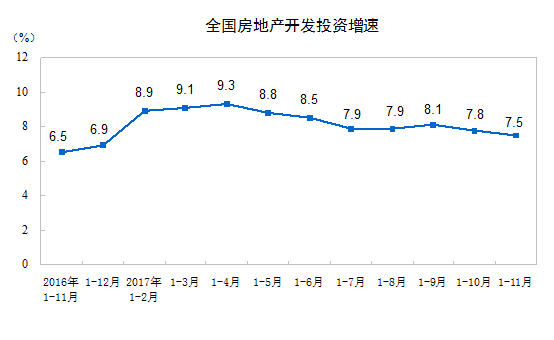 2017年1-11月份,全國房地產開發投資100387億元,同比名義增長7.5%,增速比1-10月份回落0.3個百分點。其中,住宅投資68670億元,增長9.7%,增速回落0.2個百分點。住宅投資占房地產開發投資的比重為68.4%。