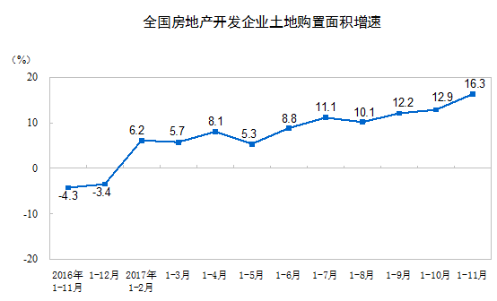 1-11月份,房地產開發企業土地購置面積22158萬平方米,同比增長16.3%,增速比1-10月份提高3.4個百分點;土地成交價款11436億元,增長47.0%,增速提高3.7個百分點。