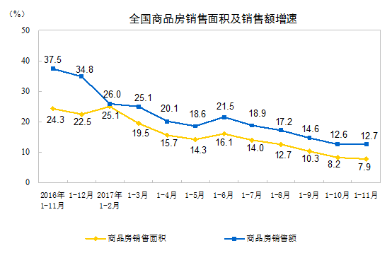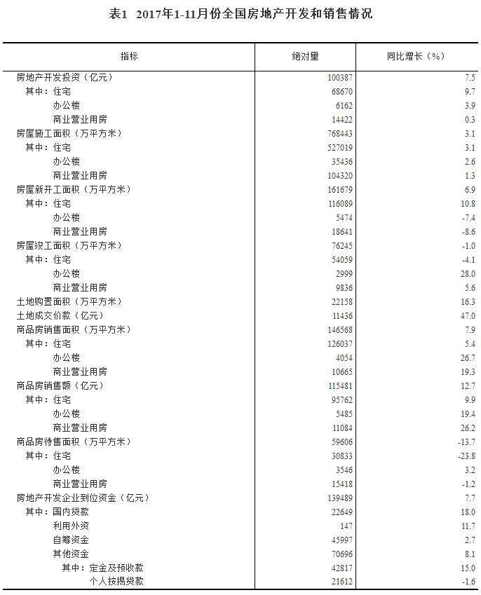 2017年1-11月份全國房地產開發投資和銷售情況