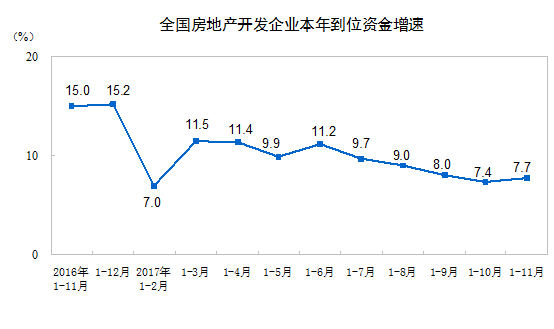 1-11月份,房地產開發企業到位資金139489億元,同比增長7.7%,增速比1-10月份提高0.3個百分點。其中,國內貸款22649億元,增長18.0%;利用外資147億元,增長11.7%;自籌資金45997億元,增長2.7%;其他資金70696億元,增長8.1%。在其他資金中,定金及預收款42817億元,增長15.0%;個人按揭貸款21612億元,下降1.6%。