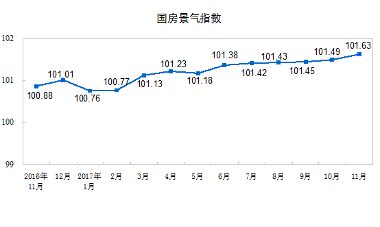 11月份,房地產開發景氣指數(簡稱“國房景氣指數”)為101.63,與10月份提高了0.14點。