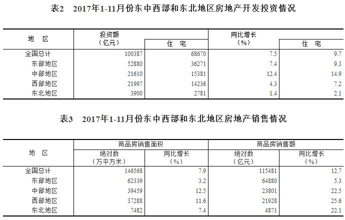 1-11月份,東部地區房地產開發投資52880億元,同比增長7.4%,增速比1-10月份回落0.6個百分點;中部地區投資21610億元,增長12.4%,增速回落0.7個百分點;西部地區投資21997億元,增長4.3%,增速提高0.2個百分點;東北地區投資3900億元,增長1.4%,1-10月份為下降0.4%。