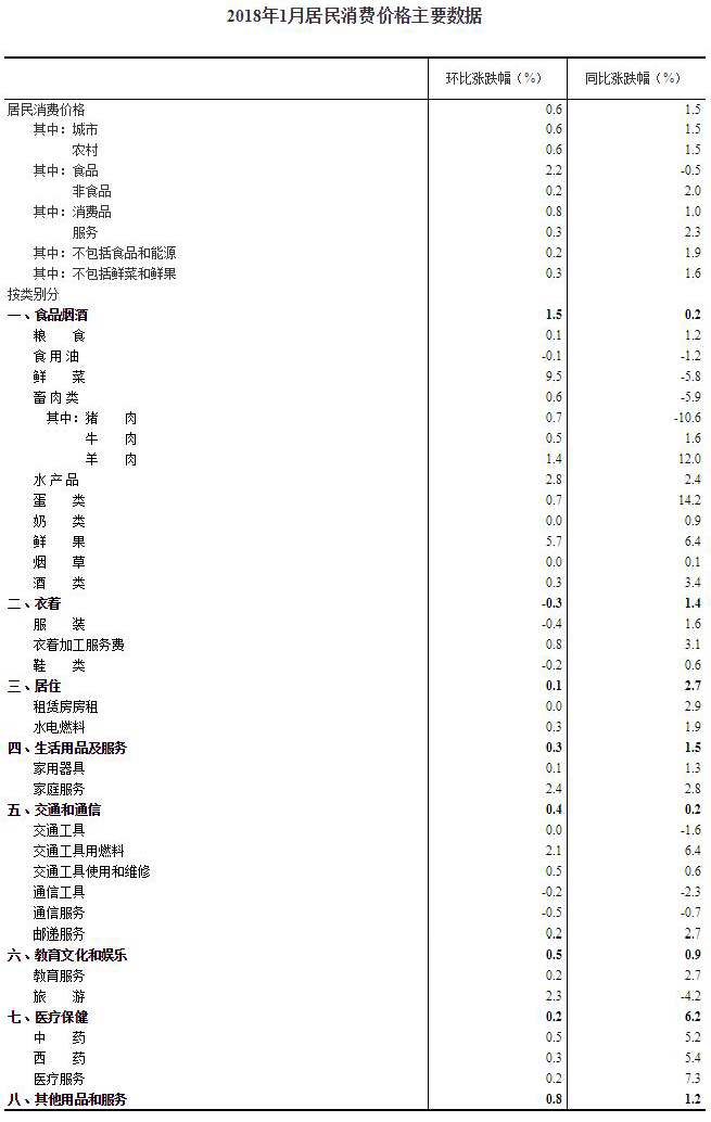 2018年1月份,全國居民消費價格同比上漲1.5%。其中,城市上漲1.5%,農(nóng)村上漲1.5%;食品價格下降0.5%,非食品價格上漲2.0%;消費品價格上漲1.0%,服務(wù)價格上漲2.3%。