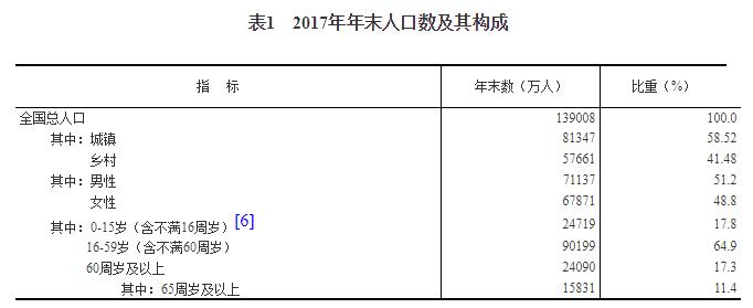 [6]2017年年末,0-14歲(含不滿15周歲)人口為23348萬人,15-59歲(含不滿60周歲)人口為91570萬人。
