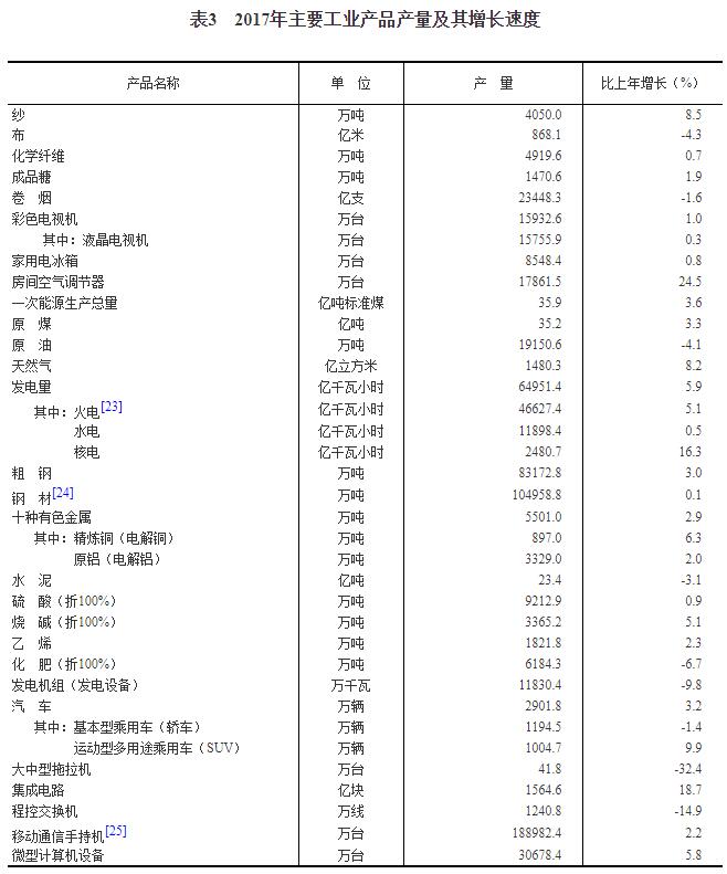 [25]移動通信手持機、鋼材2016年產量根據有關專項調查進行了調整,2017年產量增速均按可比口徑計算。