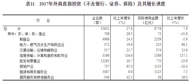 全年吸收外商直接投資(不含銀行、證券、保險)新設立企業35652家,比上年增長27.8%。實際使用外商直接投資金額8776億元(折1310億美元),增長7.9%,增速比上年加快3.8個百分點。其中“一帶一路”沿線國家對華直接投資新設立企業3857家,增長32.8%;對華直接投資金額374億元(折56億美元)。全年高技術制造業實際使用外資666億元,增長11.3%。