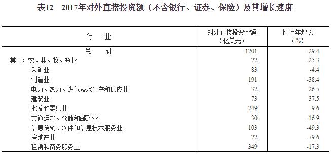 全年對外直接投資額(不含銀行、證券、保險)8108億元,按美元計價為1201億美元,比上年下降29.4%。其中,對“一帶一路”沿線國家直接投資額144億美元。