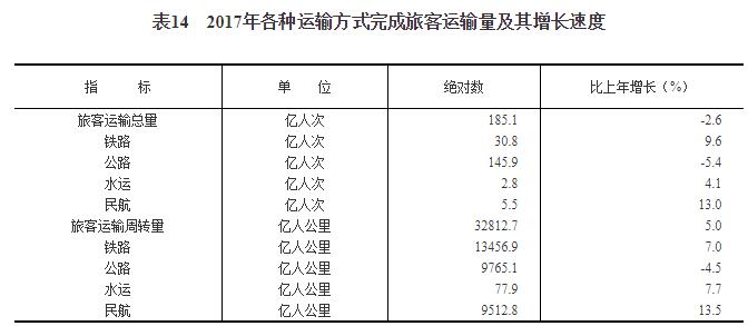 全年旅客運輸總量185億人次,比上年下降2.6%。旅客運輸周轉量32813億人公里,增長5.0%。