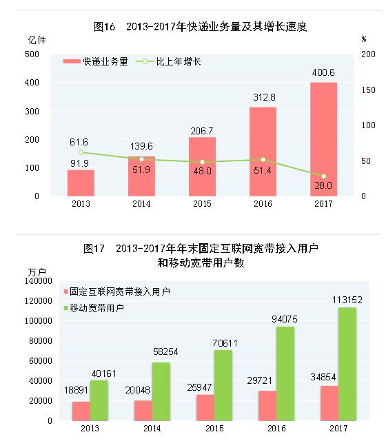 全年完成郵政行業業務總量[37]9764億元,比上年增長32.0%。郵政業全年完成郵政函件業務31.5億件,包裹業務0.3億件,快遞業務量400.6億件;快遞業務收入4957億元。全年完成電信業務總量[38]27557億元,比上年增長76.4%。電信業全年新增移動電話交換機容量[39]23646萬戶,達到242186萬戶。年末全國電話用戶總數161125萬戶,其中移動電話用戶141749萬戶。移動電話普及率上升至102.5部/百人。固定互聯網寬帶接入用戶[40]34854萬戶,比上年增加5133萬戶,其中固定互聯網光纖寬帶接入用戶[41]29392萬戶,比上年增加6627萬戶;移動寬帶用戶[42]113152萬戶,增加19077萬戶。移動互聯網接入流量246億G,比上年增長162.7%。互聯網上網人數7.72億人,增加4074萬人,其中手機上網人數[43]7.53億人,增加5734萬人。互聯網普及率達到55.8%,其中農村地區互聯網普及率達到35.4%。軟件和信息技術服務業[44]完成軟件業務收入55037億元,比上年增長13.9%。