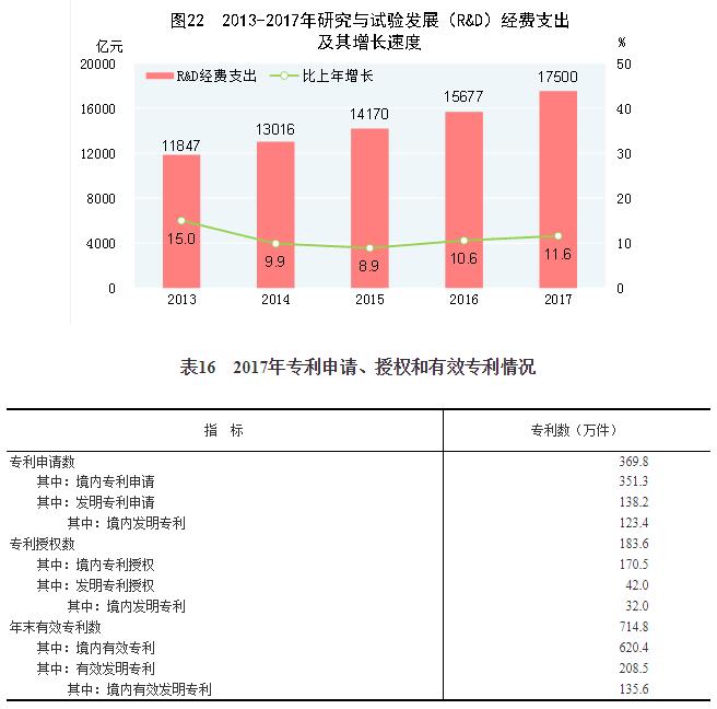 全年研究與試驗發展(R&D)經費支出17500億元,比上年增長11.6%,與國內生產總值之比為2.12%,其中基礎研究經費920億元。全年國家重點研發計劃共安排42個重點專項1115個科技項目,國家科技重大專項共安排454個課題,國家自然科學基金共資助43935個項目。截至年底,累計建設國家重點實驗室503個,國家工程研究中心131個,國家工程實驗室217個,國家企業技術中心1276家。國家科技成果轉化引導基金累計設立5支子基金,資金總規模247.2億元。全年境內外專利申請369.8萬件,授予專利權183.6萬件;PCT專利申請受理量[60]為5.1萬件。截至年底,有效專利714.8萬件,其中境內有效發明專利135.6萬件,每萬人口發明專利擁有量9.8件。全年共簽訂技術合同36.8萬項,技術合同成交金額13424億元,比上年增長17.7%。