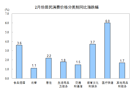 食品煙酒價格同比上漲3.6%,影響居民消費價格總水平上漲約1.09個百分點。其中,蛋類價格上漲22.5%,影響居民消費價格總水平上漲約0.12個百分點;鮮菜價格上漲17.7%,影響居民消費價格總水平上漲約0.47個百分點;水產品和鮮果價格均上漲8.7%,合計影響居民消費價格總水平上漲約0.31個百分點;畜肉類價格下降3.1%,影響居民消費價格總水平下降約0.15個百分點(豬肉價格下降7.3%,影響居民消費價格總水平下降約0.20個百分點)。 其他七大類價格同比均上漲。其中,醫療保健、教育文化和娛樂、居住價格分別上漲6.0%、3.7%和2.2%,生活用品及服務、其他用品和服務價格分別上漲1.8%和1.7%,交通和通信、衣著價格分別上漲1.5%和1.1%。