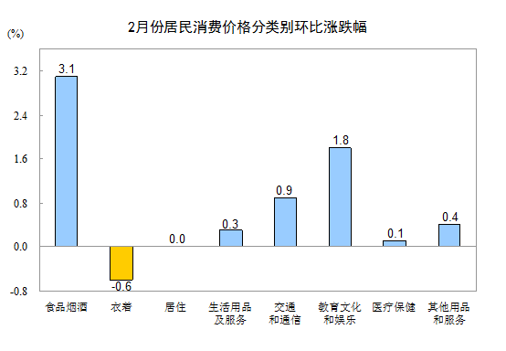 2月份,全國居民消費價格環比上漲1.2%。其中,城市上漲1.3%,農村上漲1.1%;食品價格上漲4.4%,非食品價格上漲0.5%;消費品價格上漲1.4%,服務價格上漲1.0%。