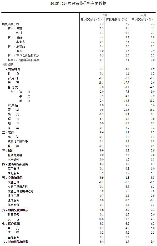 2018年2月份,全國居民消費價格同比上漲2.9%。其中,城市上漲3.0%,農村上漲2.7%;食品價格上漲4.4%,非食品價格上漲2.5%;消費品價格上漲2.5%,服務價格上漲3.6%。1-2月平均,全國居民消費價格比去年同期上漲2.2%。