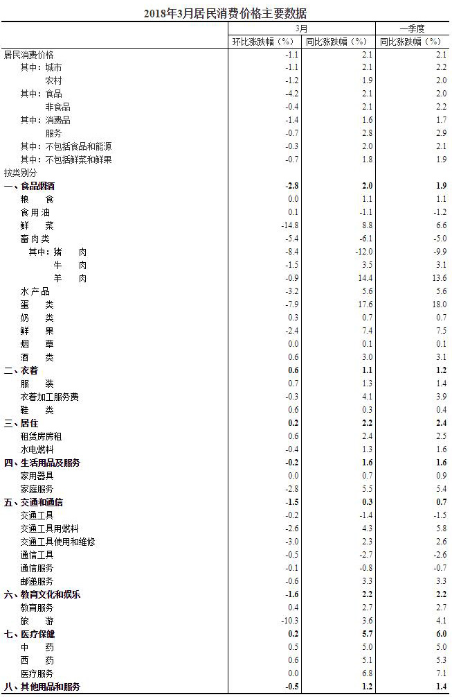 2018年3月份,全國(guó)居民消費(fèi)價(jià)格同比上漲2.1%。其中,城市上漲2.1%,農(nóng)村上漲1.9%;食品價(jià)格上漲2.1%,非食品價(jià)格上漲2.1%;消費(fèi)品價(jià)格上漲1.6%,服務(wù)價(jià)格上漲2.8%。一季度,全國(guó)居民消費(fèi)價(jià)格總水平比去年同期上漲2.1%。。