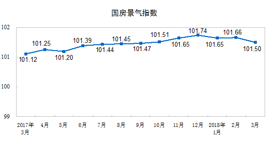 3月份,房地產(chǎn)開發(fā)景氣指數(shù)(簡稱“國房景氣指數(shù)”)為101.50,比2月份回落0.16點。