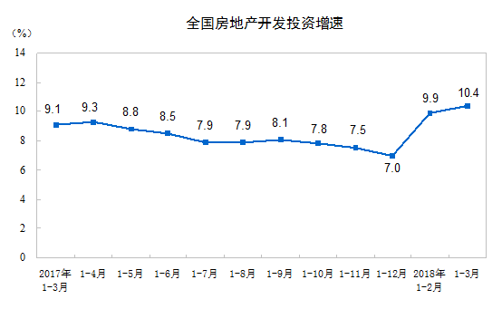 2018年1-3月份,全國房地產(chǎn)開發(fā)投資21291億元,同比名義增長10.4%,增速比1-2月份提高0.5個百分點。其中,住宅投資14705億元,增長13.3%,增速提高1個百分點。住宅投資占房地產(chǎn)開發(fā)投資的比重為69.1%。