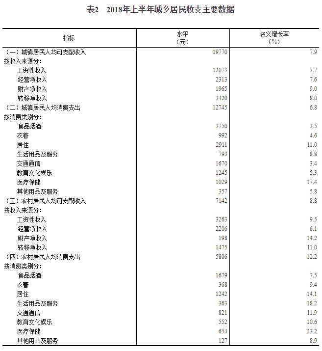 2018年上半年,全國居民人均可支配收入14063元,比上年同期名義增長8.7%,扣除價格因素,實際增長6.6%。其中,城鎮居民人均可支配收入19770元,增長(以下如無特別說明,均為同比名義增長) 7.9%,扣除價格因素,實際增長5.8%;農村居民人均可支配收入7142元,增長8.8%,扣除價格因素,實際增長6.8%。