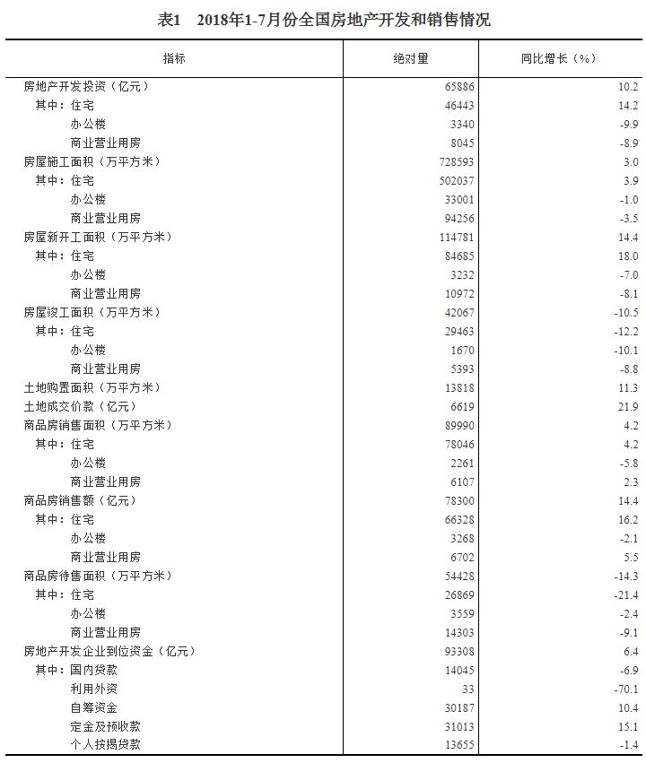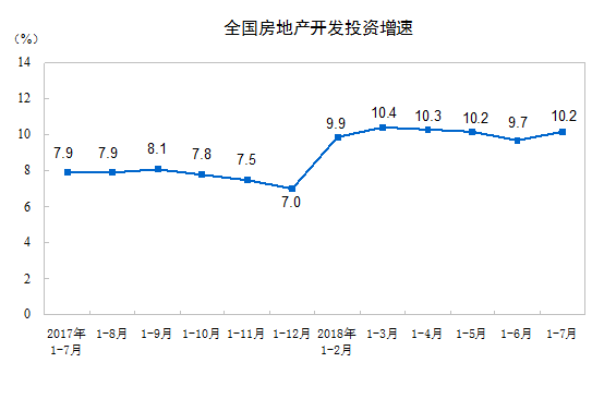2018年1-7月份,全國房地產開發投資65886億元,同比增長10.2%,增速比1-6月份提高0.5個百分點。其中,住宅投資46443億元,增長14.2%,增速提高0.6個百分點。住宅投資占房地產開發投資的比重為70.5%。