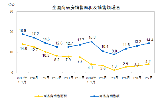 1-7月份,商品房銷售面積89990萬平方米,同比增長4.2%,增速比1-6月份提高0.9個百分點。其中,住宅銷售面積增長4.2%,辦公樓銷售面積下降5.8%,商業營業用房銷售面積增長2.3%。商品房銷售額78300億元,增長14.4%,增速提高1.2個百分點。其中,住宅銷售額增長16.2%,辦公樓銷售額下降2.1%,商業營業用房銷售額增長5.5%。