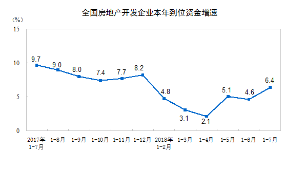 1-7月份,房地產開發企業到位資金93308億元,同比增長6.4%,增速比1-6月份提高1.8個百分點。其中,國內貸款14045億元,下降6.9%;利用外資33億元,下降70.1%;自籌資金30187億元,增長10.4%;定金及預收款31013億元,增長15.1%;個人按揭貸款13655億元,下降1.4%。
