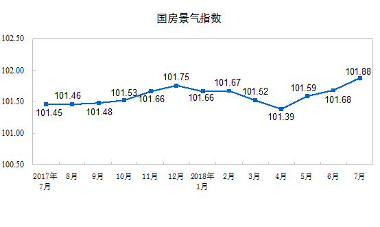 7月份,房地產開發景氣指數(簡稱“國房景氣指數”)為101.88,比6月份提高0.20點。