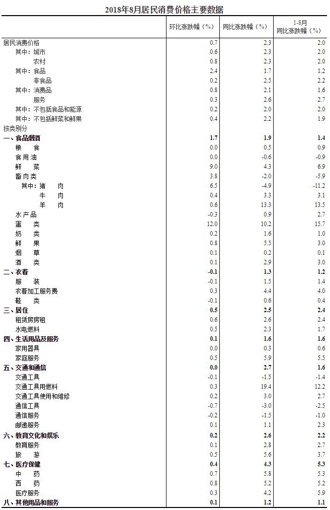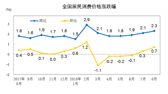 2018年8月份居民消費(fèi)價(jià)格同比上漲2.3%