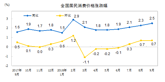 2018年9月份居民消費(fèi)價(jià)格同比上漲2.5%