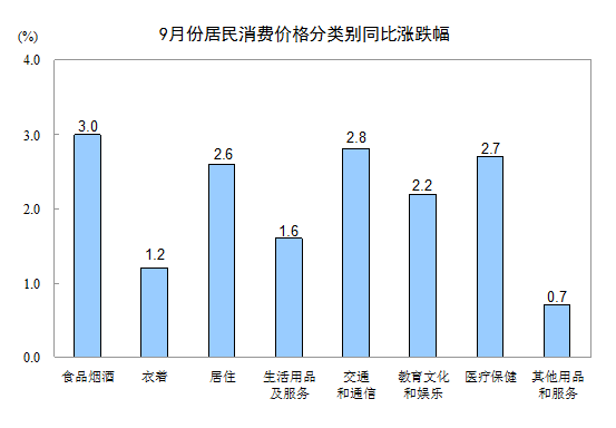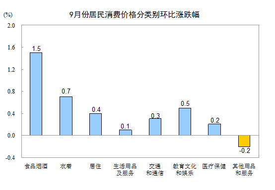 9月份,全國(guó)居民消費(fèi)價(jià)格環(huán)比上漲0.7%。其中,城市上漲0.7%,農(nóng)村上漲0.8%;食品價(jià)格上漲2.4%,非食品價(jià)格上漲0.3%;消費(fèi)品價(jià)格上漲1.0%,服務(wù)價(jià)格上漲0.2%。